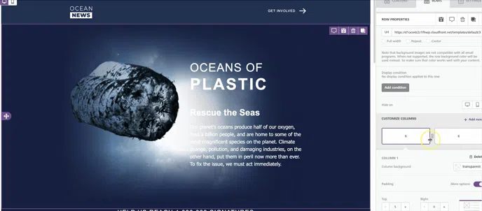 Once you start designing, add a row with the number of columns you need. Then, from the side panel, you can adjust the size of the existing columns by dragging the divider. You can also add or delete columns from the existing row.