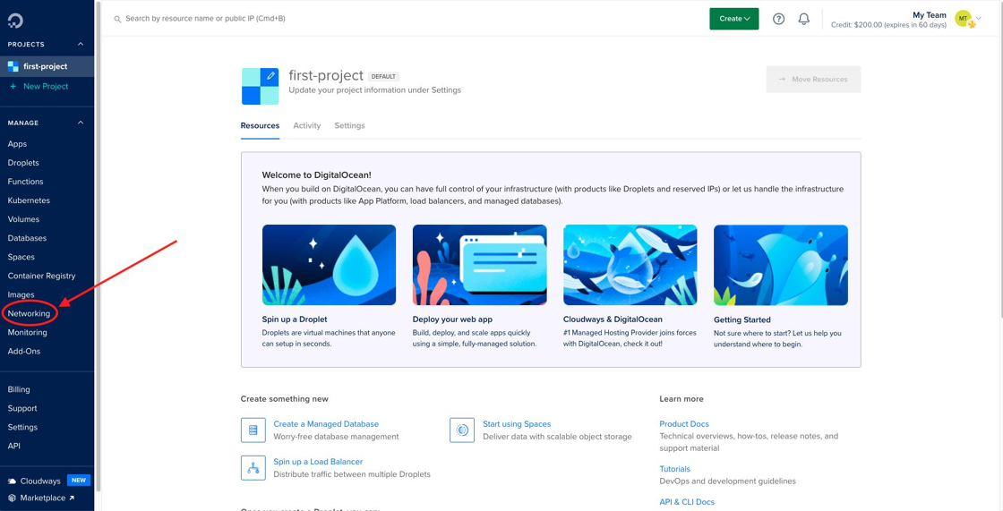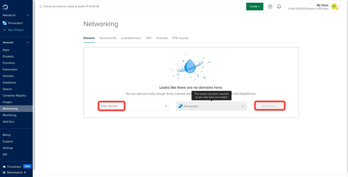 Adding a (sub)domain within the DigitalOcean Control Panel only takes 3 steps, and the steps to access an existing domain are virtually identical (except for the last step where instead of creating a new domain you'll click the existing domain). We will list those steps below, but if desired, you can also reference DigitalOcean's Add A Domain and Add A Subdomain To Your Domain articles.