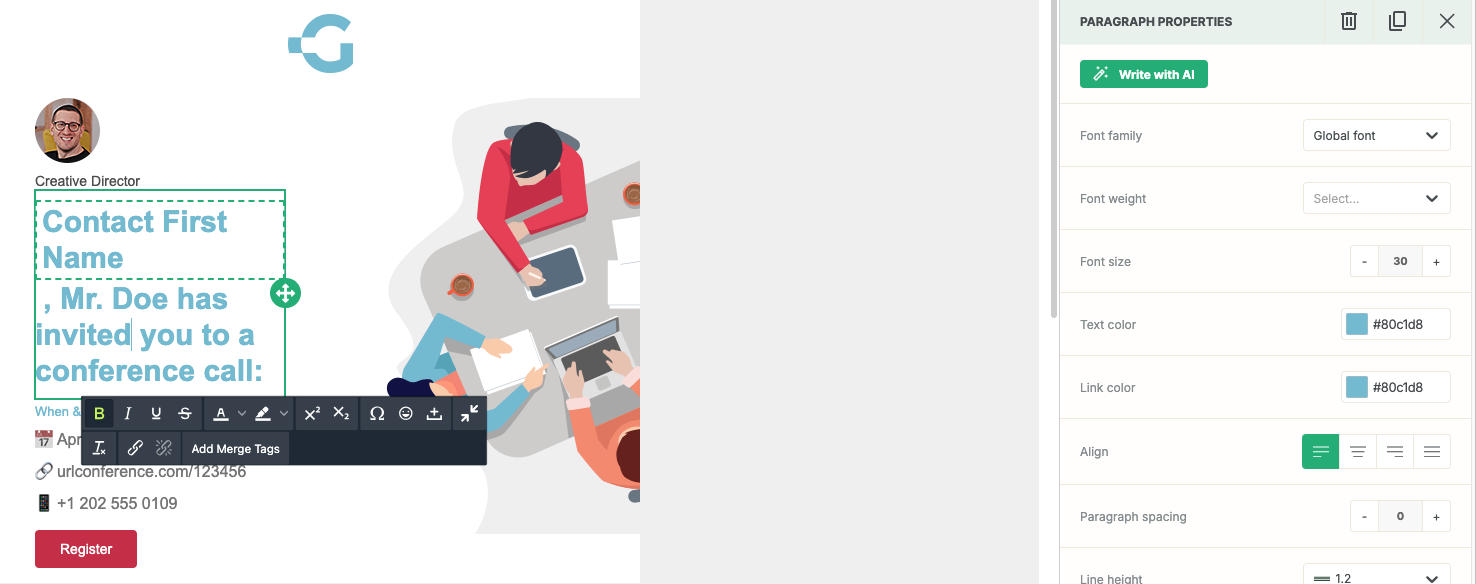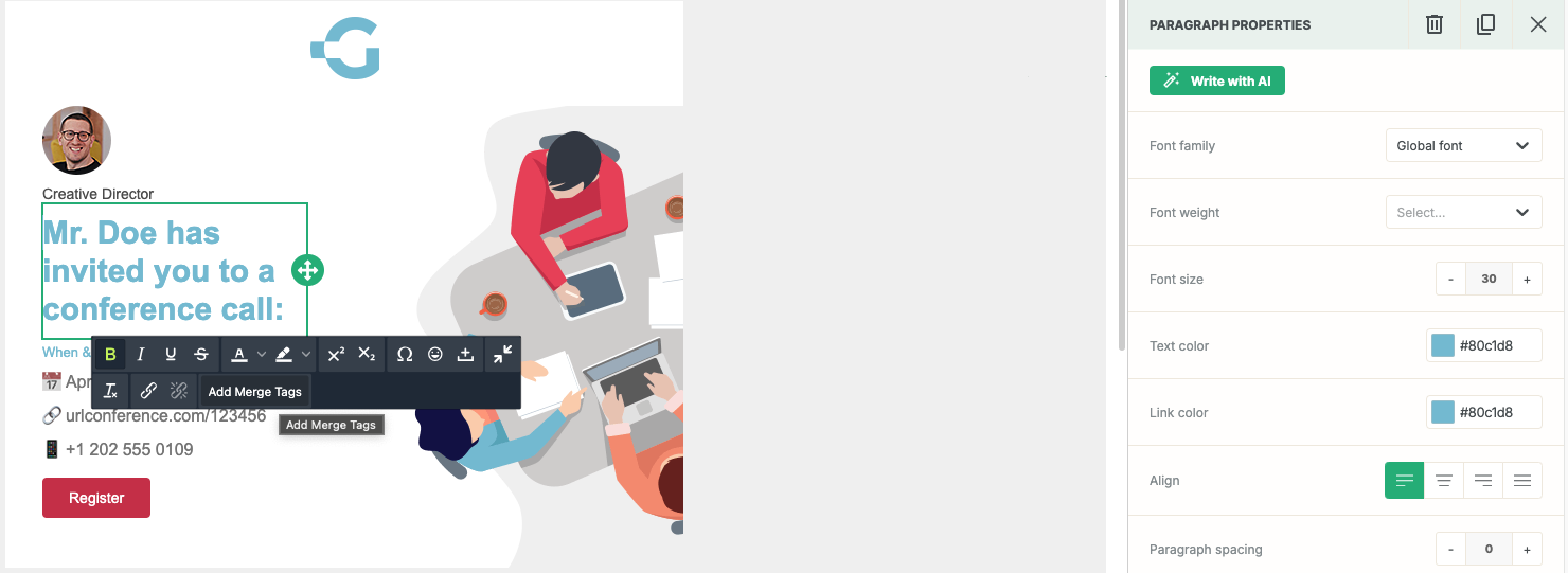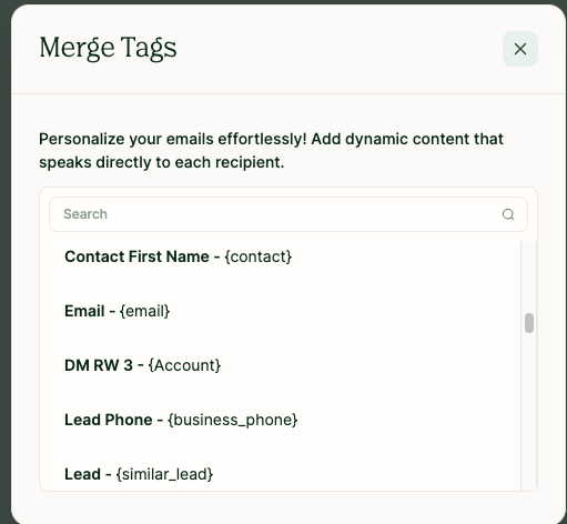 3. Click on the "Add Merge Tags" button to launch the merge tags modal: