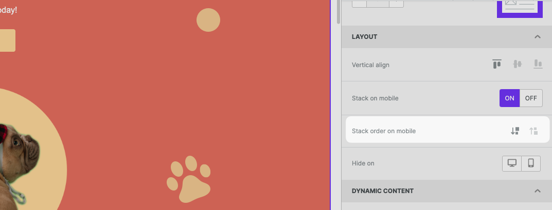 In some cases, the columns stacked on mobile can work better in a reversed order. Use Stack order on mobile to define the order that works best for your design on a mobile device.