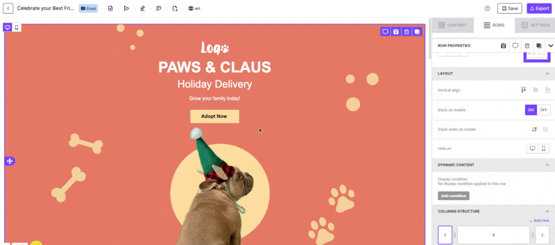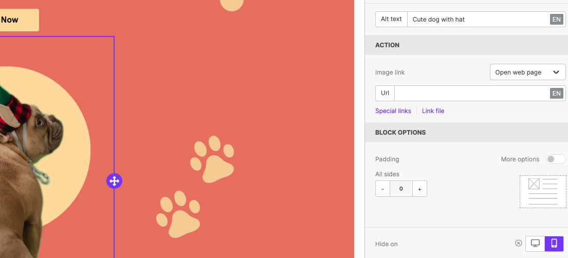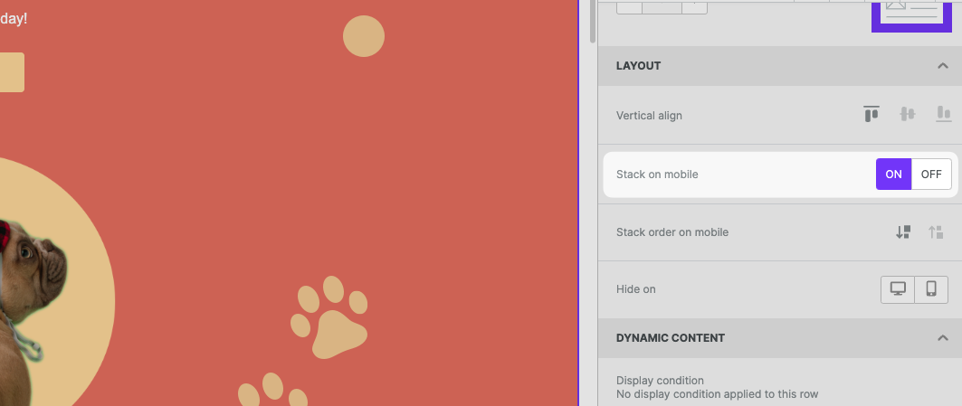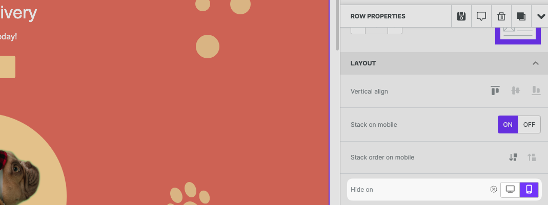 The Hide on feature is available on both the content level and the row level. This means you can now hide individual content blocks or entire rows from a specific type of device.
