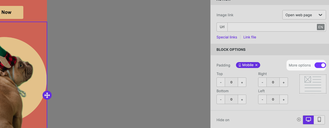 All content blocks in the builder include a Hide on setting in the property panel. To use it, scroll down until you see the Block Options section.