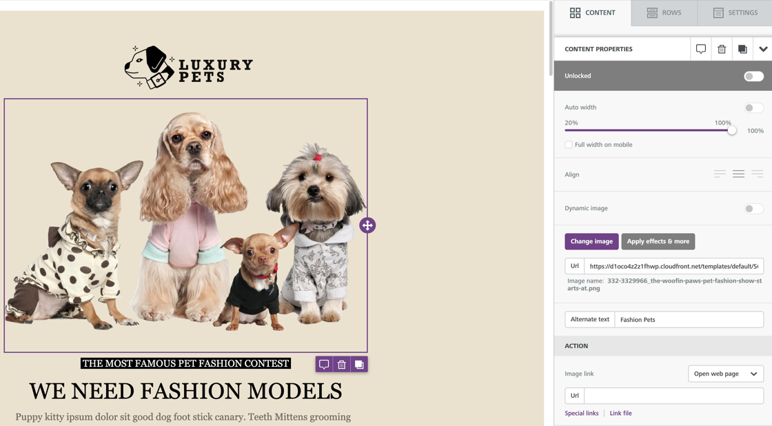 Every content block has its own settings, such as granular control on padding. The right-side panel automatically switches to a property panel for the selected content element.