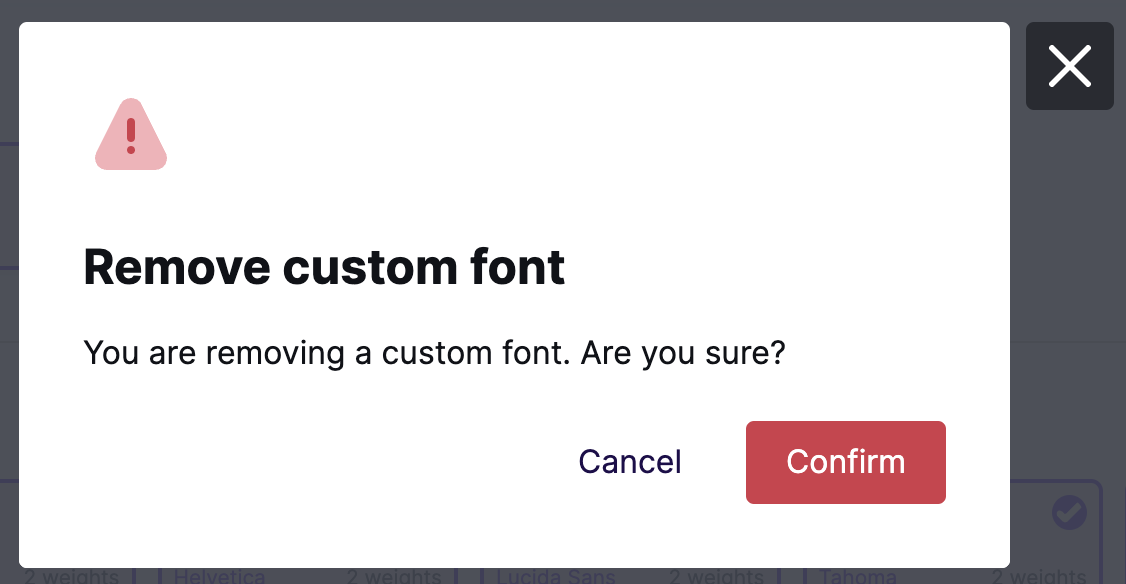 You cannot edit a custom font. If you want to edit the settings, we recommend you delete and re-import the font. You can view the existing settings for your font at any time by clicking on the font card within your settings. To delete an existing custom font move the mouse cursor over the ✔ mark. The icon will change to a 𝙓 indicating the delete action.