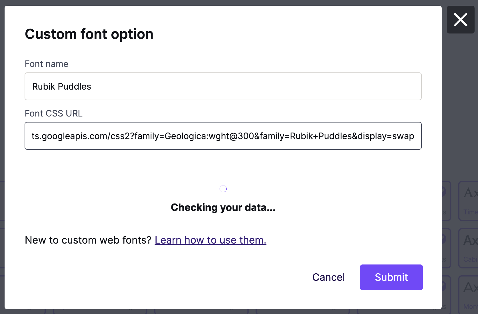 Once you insert your CSS URL, we perform some checks to make sure it's a valid stylesheet. You'll see a message that says Checking your data... while we do this. If the stylesheet is valid, some new fields will populate.