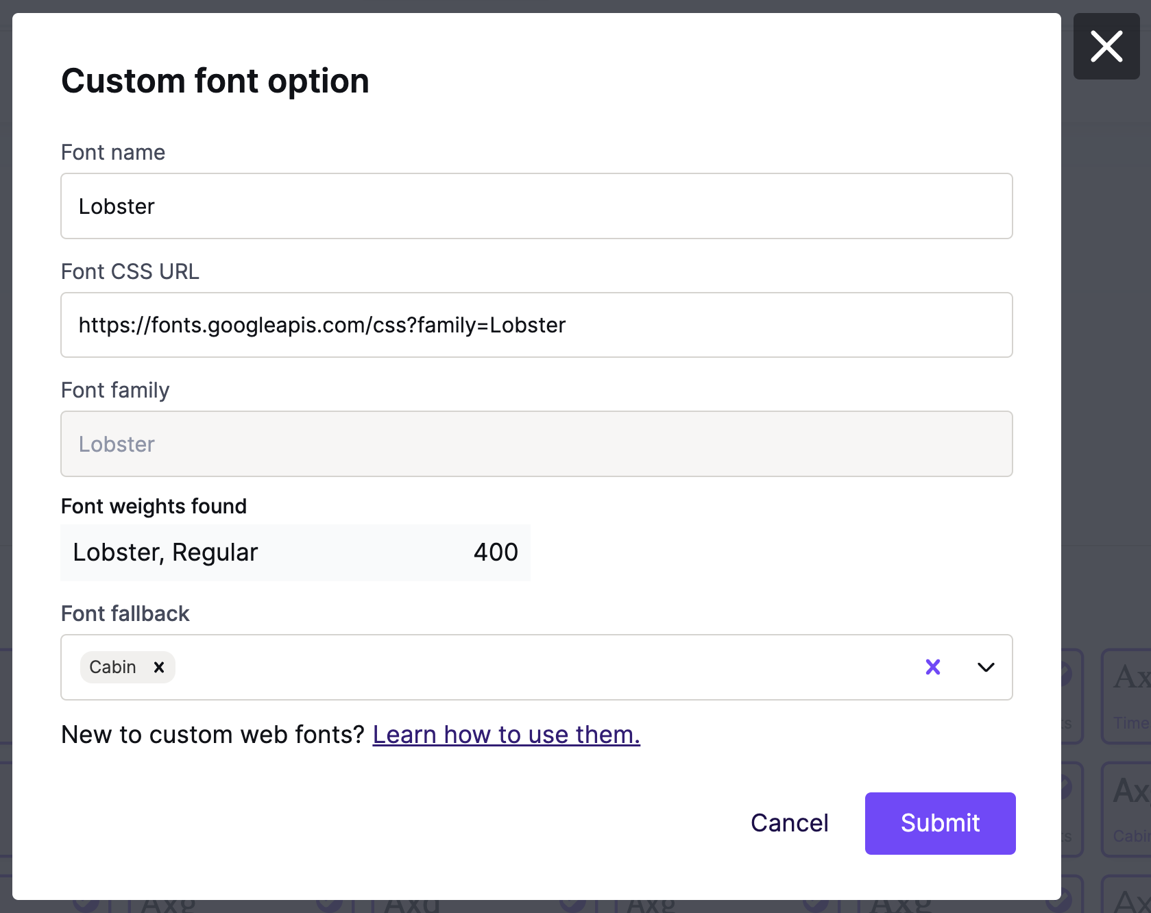 This section only populates if you input a CSS URL referring to more than one font. You must use the dropdown to select which font you want to import. By default, we'll select the first font listed in the stylesheet.