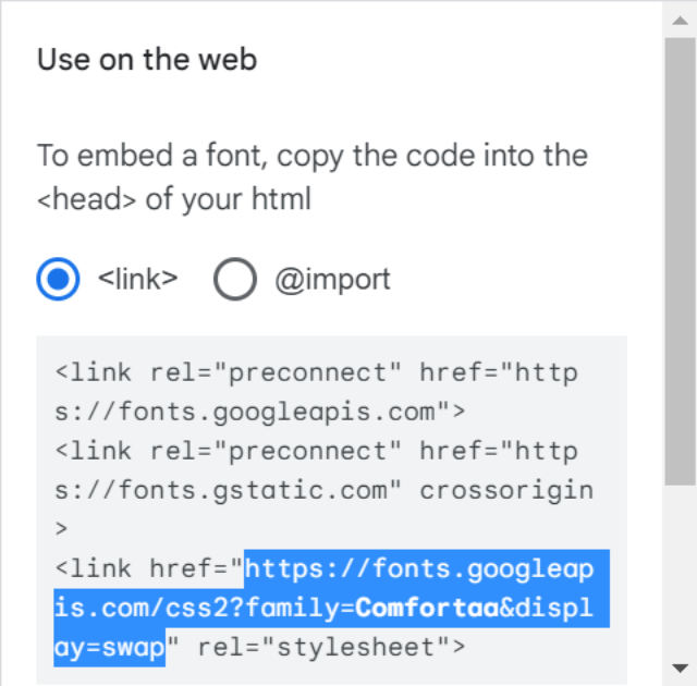 Google Fonts provides a rich catalog of web fonts free of charge and ready to use. In order to use a Google Font in Tenon, start by copying just the HREF content from the widget. You can see an example of this below.