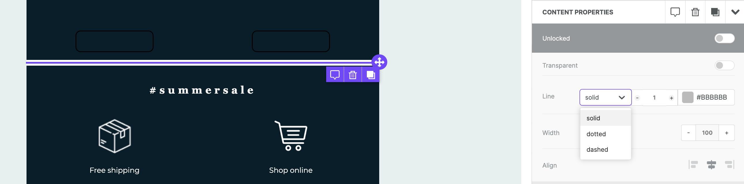 If you prefer to have a visible divider, you can customize the look and feel using the Line settings in the sidebar. These settings include line appearance (solid, dotted, or dashed), line height, and a color picker.