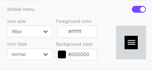 The foreground color will apply to the icon details, as well as the text color once your menu icon is expanded. The background color will populate only as the background color of your icon. The background color of your expanded menu will match what you have set as your content background color.
