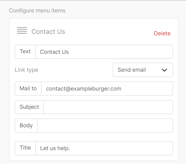 Once you begin adding items to your menu, you'll have a couple of options. Text is what you'll see written in your menu, and you can set the text hyperlink through the Url field. The text you input into the Title field will populate if you hover over that option on the builder stage.